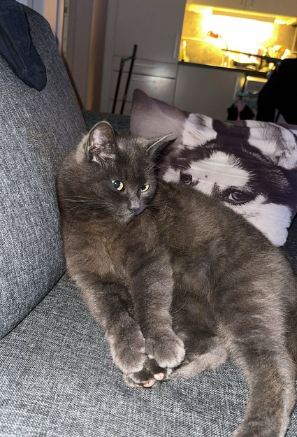 Han er grå, kan se litt mokka brun ut i enkelte lys, ganske så tykk pels. rosa i poteputene,og han er veldig gla i kos, ligge og rulle seg på bakken.