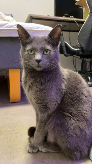 Grå med ganske lang hale og lange ører med en chip i det ene, veldig engstelig og personknyttet katt så sniker seg nok mest rundt og stikker av veldig lett.