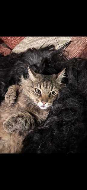 Slank. 8 år. Brunrødt merke i det ene øyet. Semi-langhåret, men avrøytet for sommeren. Kan prate. Ofte kosete. Ikke veldig redd for hunder.
