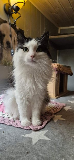 Litt forsiktig langhåra hunkatt . Kan være sosial å søke til folk