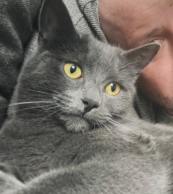 Katt 1 år gammel liten grå jente med gule øyne. Og en liten hvit flekk under haka. Liten skadet på rompa, men har grodd.