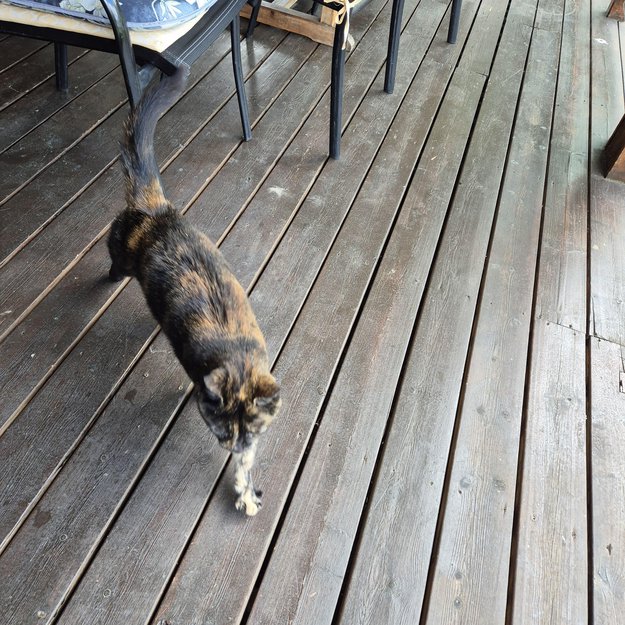 Katten bare dukket opp utenfor huset og har vært her og prøvd å komme inn i flere dager. Mjauer, ruller rundt og stryker seg inntil oss og er ekstremt menneskekjær.