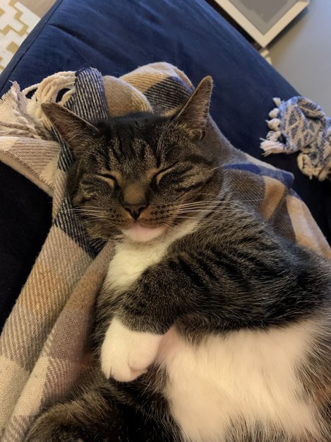 Snill og rolig hannkatt med makrellmønstret pels, hvit på magen og potene.