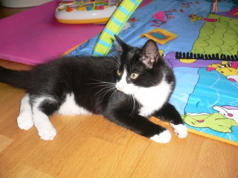 Katten er er sort med hvite labber og mave. Ikke den samme som den på bildet, men tilsvarende lik.