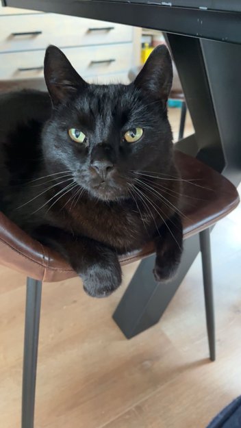 Brunsvart pels med noen få hvite hårstrå på brystet. Han er ID-merket og kastrert, men er fortsatt registrert på tidligere eier så vi har ikke tilgang til ID-nummeret for øyeblikket.