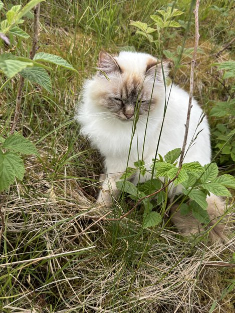 Funnet en hvit og brun maske farget katt med blå øyne. Ser ut som en Hellig Birma. Katten er meget tam.