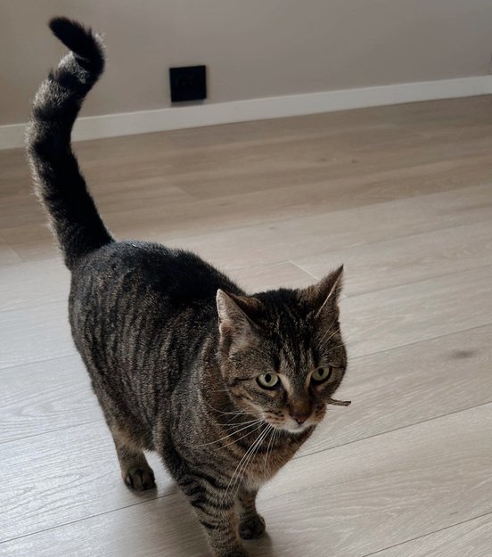 Hun heter Zoya. Chippet og kastrert. Pelsen er en blanding av svart, grå og beige. Tiger mønstret. Grønne øyne. Kan være litt skeptisk til nye mennesker eller lyder, men er også veldig kosete. Hun er 7 år.