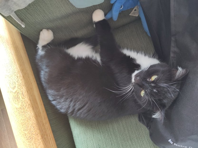 Svart med hvite poter, hvit mage, bryst og hake, og en liten hvit flekk i pannen. Gulgrønne øyne. Ganske liten, med lys stemme. Hun er chippet (bare hadde ikke nummeret foran meg nå).
