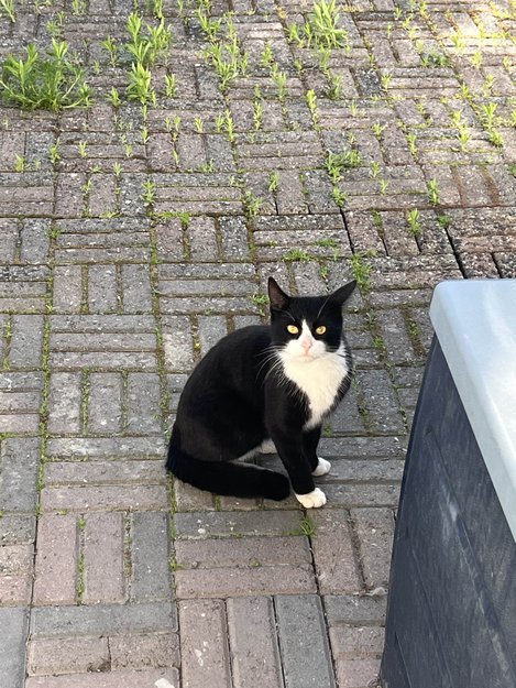 Veldig redd, men sulten sort og hvit katt lusker rundt leiligheten vår. Den har kommet og gått over en cirka en uke, men løper så fort du nærmer deg.