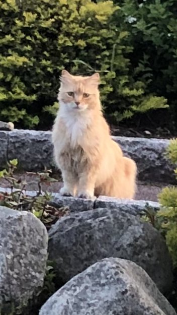 Det er en oransje og hvit katt, halvlangt hår, veldig pen, men pelsen ser full av knuter og klumper. Rene øyne og ganske tamme, men redd for å komme for nær. Ingen halsbånd på og kan ikke komme nær for å sjekke for chip. Send en melding for flere bilder.