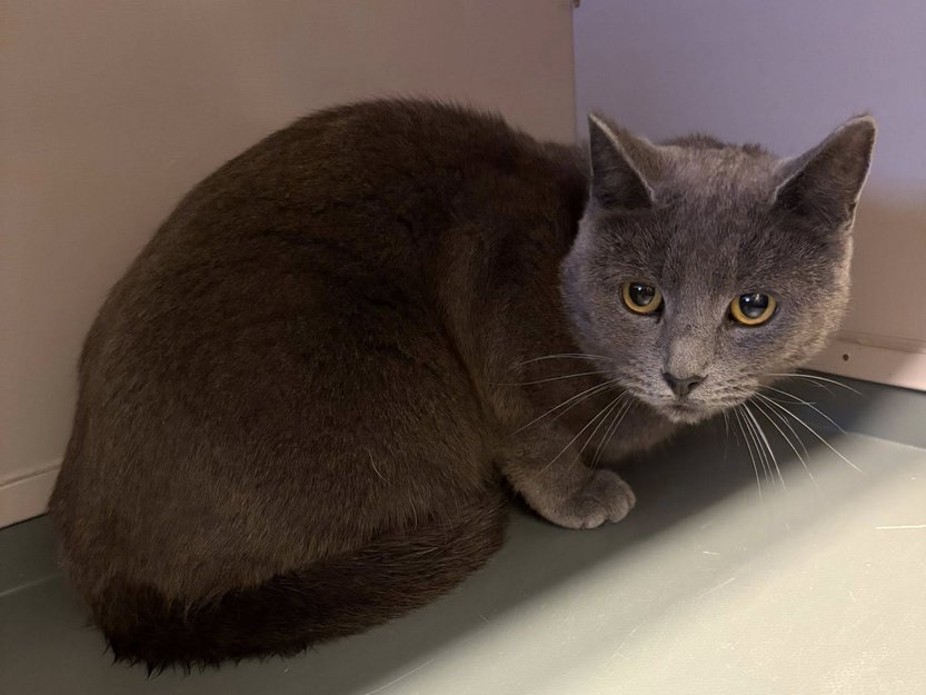 Katten har korthåret grå pels, svart nese og gule øyne.