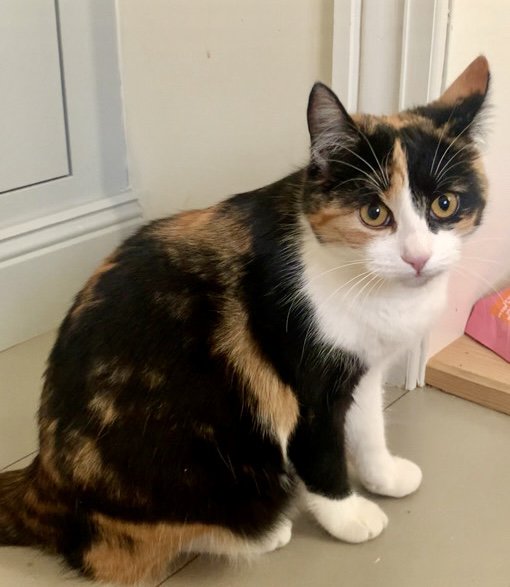 Hun har tricolor pels. Hvit under mage, bryst og hake. Ett svart og ett oransje øre. Resten av kroppen varierer med svart og oransje farger.