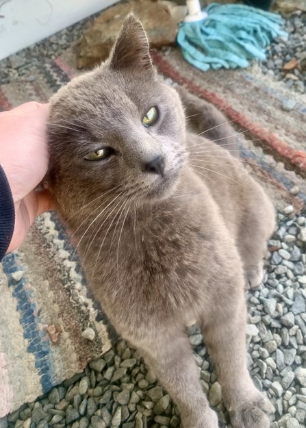 Han er ensfarget grå. Et lite kutt i venstre øre, tam, men noe skvetten. Han mjauer sårt, er ikke kastrert.