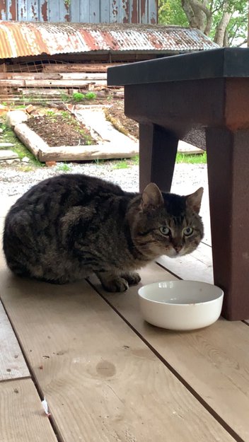 Liten og veldig sky katt har oppholdt seg ute hos meg i flere mnd. Jeg trodde lenge det var nabokatt på besøk, har først den siste tiden skjønt at det ikke stemmer. Jeg gir den mat og drikke ute, og den sover trolig i fjøset. Den er for sky til at jeg komme bort til den.