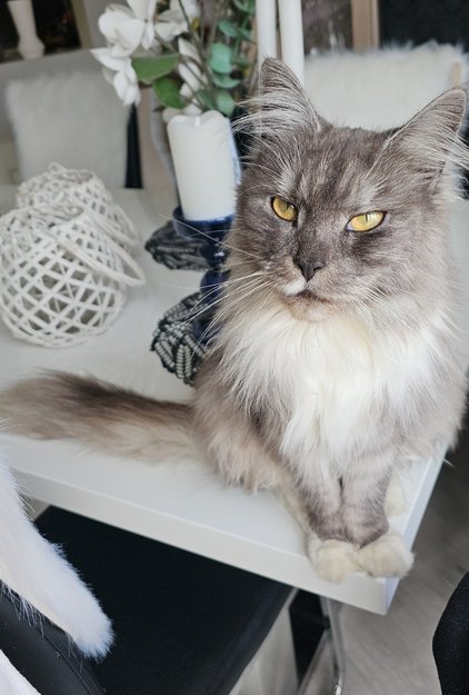 Grå og hvit i pelsen, lita i str til å være maine coon ca 5 kg.