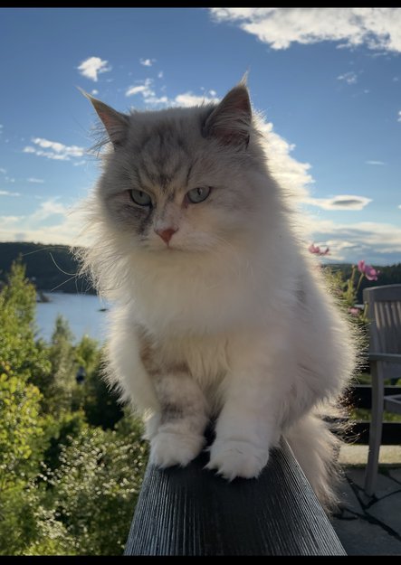 Hvit med brunt grått i pelsen, halen er mest grå. Langhåret, fluffy. Har blå øyne. Veier ca 4 kg, liten og rund. Korte ben. Sky. Pratsom. Klarte ikke legge inn riktig posisjon på kartet men hytta ligger i tomtersvei i Drøbak. Har kort pels på magen, nærmest litt krøller.