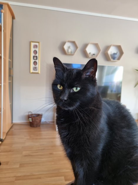 Den er helsvart og har en ganske markant hengemage..løst skinn under buken..