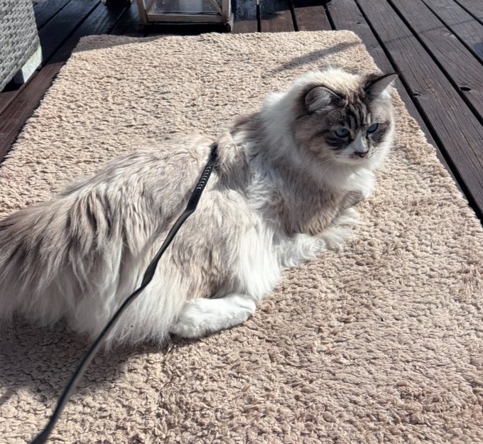 Max er en langhåret Ragdoll med store blå øyer. Hvit krage, grå/sort på halen og stripete på snuten. 1 år gammel. Chippet og kastrert