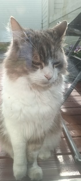 Katten blei funnet ventende foran døren våres,etter noen månender kom den forsatt in på besøk.Da posta vi om katten på fb grupper,men ingen kjente den igjen.