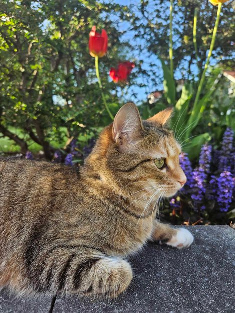Lala er en liten flerfarget/tigerstripete katt med hvit hals og hvite poter/føtter. Hun har på seg et grått flått-halsbånd.