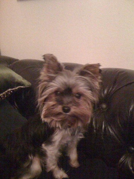 hun er bittelien miniatyr av rasen yorkshire terrier og er svart med rødt/ brunt/hvitt skjegg i ansiktet.