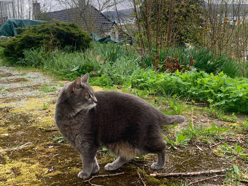 Grå, svakt tigret, Litt liten, voksen hunnkatt, lett gjenkjennelig på den korte halen.