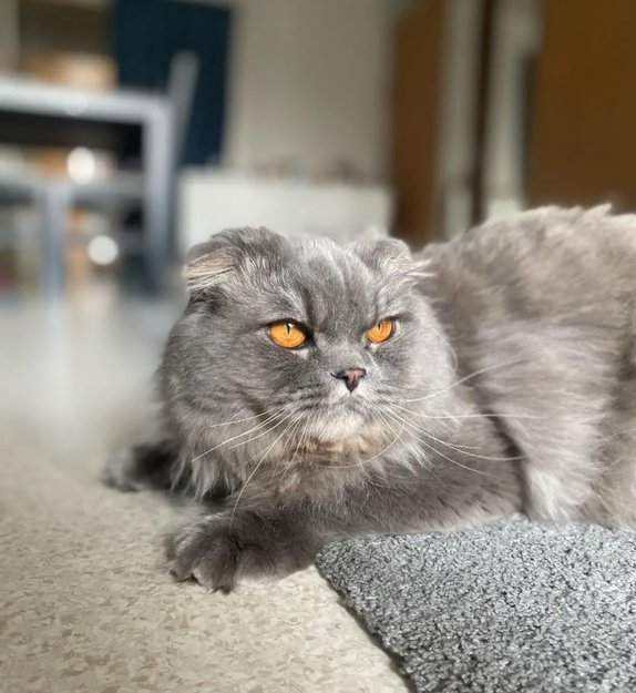 🔹 Kjennetegn: Brettede ører og litt lysere pels under haken