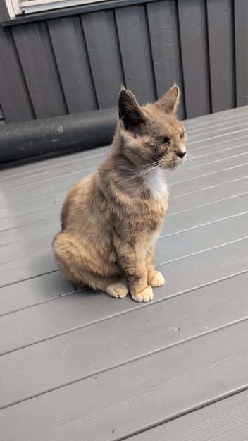 Relativt stor. Stille av seg og litt redd nye mennesker. Cirka 10 år gammel