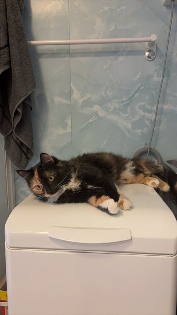 Tricolor, langhåret hunnkatt. Liten, 3 kg. ca. Lang pels på halen, lyse poter og området på brystet er hvitt. Ansiktet er halvt svart og halvt oransj. Grønne øyne.