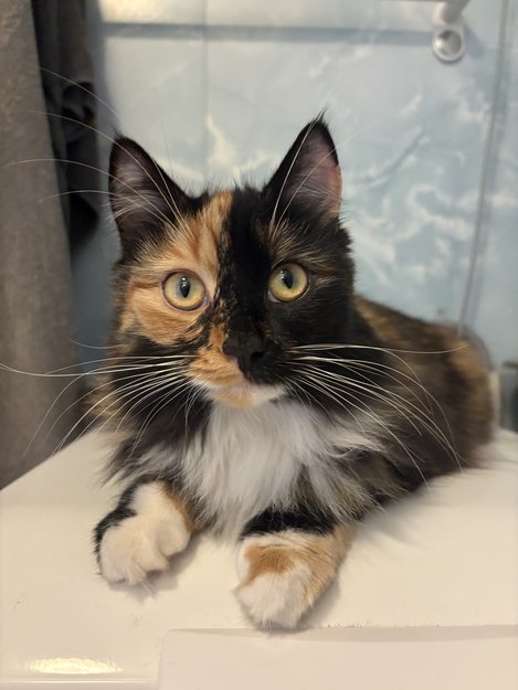 Tricolor, langhåret hunnkatt. Liten, 3 kg. ca. Lang pels på halen, lyse poter og området på brystet er hvitt. Ansiktet er halvt svart og halvt oransj. Grønne øyne.