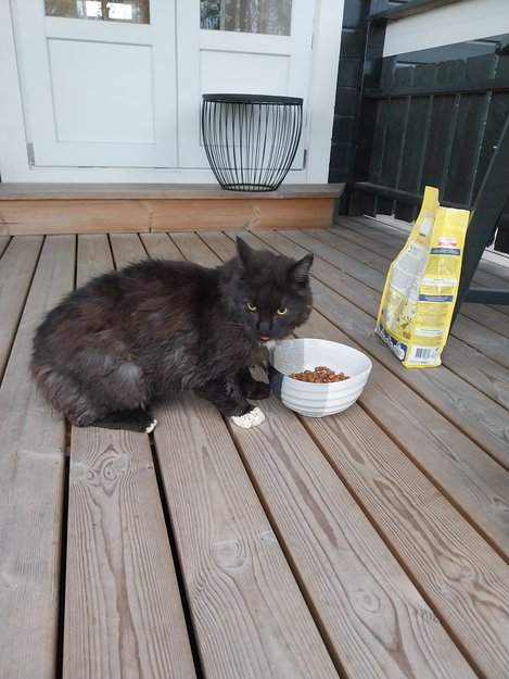 Kommer en katt som har masse tover,ser ustelt ut.Veldig kontaktsøkende og tydelig sulten (den spiste av tørrforet til mine katter som står ute om natten da de vil være ute nå på sommeren) Kommer tilbake hver dag ca kl 19.00 på kvelden,sover i hagestolene her og går om morgenen da jeg lufter hundene. Prøver å få bli m inn også.Katten ser ut som den har blitt klippet. Halter litt på ene frembenet.