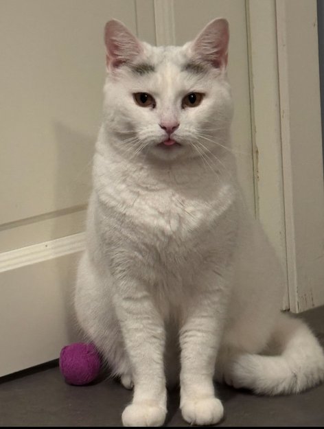 Hvit hunnkatt, To grå flekker på hodet, liker kos og kan bite litt.. hvit og myk pels