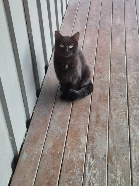 Svart hannkatt med kort, tjukk pels. Brunskjær i pelsen. Noen få hvite hårstrå høyt på brystet.