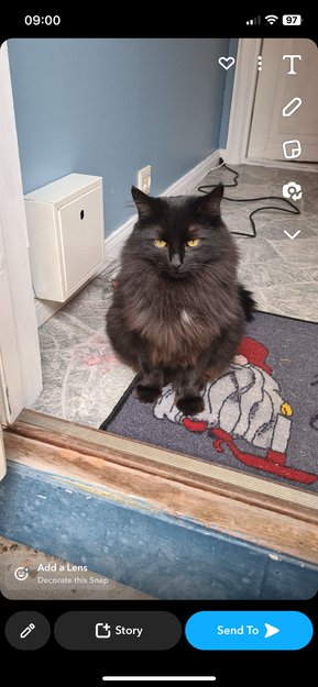 Svart skogskatt med noe hvitt på brystet. Sky for spesielt voksne, men glad i barn. En pratesyk dame. Elsker våtfor og godbiter