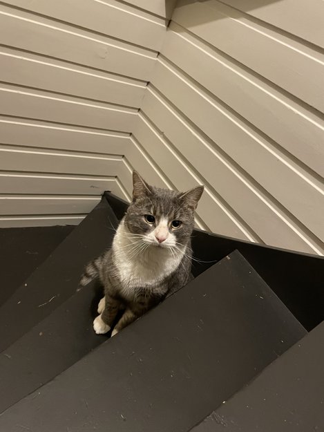 Grå, hvitt, katt som er 2 år som ikkje er kastrert.