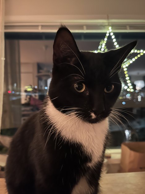 Tassen er en svart og hvit katt, tydelig kjennetegn er den hvite flekken ved nesen. Tassen er en kosete og tillitsfull katt!