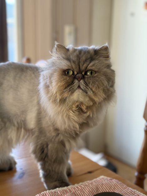 Hun er grå og har èn oransje tå, grynter når hun puster. Pelsen på kroppen er klipt kort. En hyggelig og kosete pus.