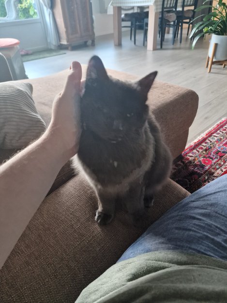 Hun har lang grå pels med et bittelite hint av en hvit flekk på halsen. Gule øyne, korte bein. Hun er lang, så kan strekke seg ut til å se stor ut, men kan også se velsig liten ut om hun kryper seg sammen.