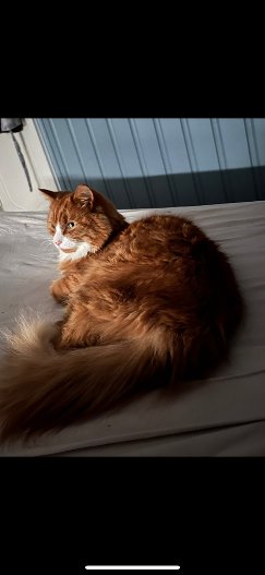 Ninja er en kjælen og sosial hannkatt med lang oransje pels og flott buskete hale. Han har hvit markering på brystet og et hakk i det ene øret. Han er chippet og kastrert.
