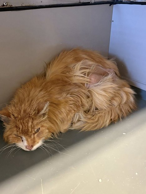 Katten er redd, har flokete pels og er avmagret og slapp. Vi antar at han er ca. 3 år gammel.