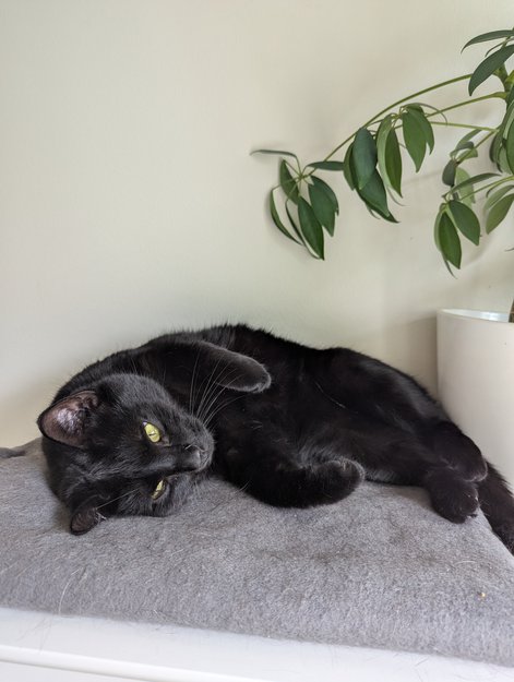 Hun er helsort bortsett fra en hvit flekk på brystet og noe hvitt på magen. Cirka 4kg og ser ganske muskuløs ut (bygget litt som en hannkatt).