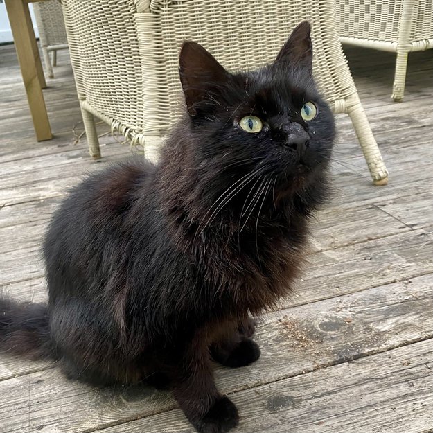 Sort med litt islett av brunt. Gule øyne. Veldig tillitsfull og kosete. Kraftig bygget, men absolutt ikke feit.