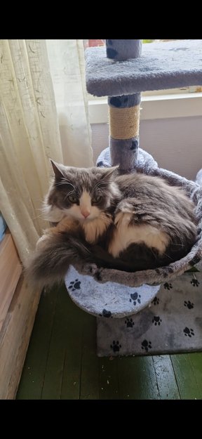 Liten katt på ca 2 kg, hun er skipskatt og har derfor en ekstra tommel og store poter. Nysjerrig katt
