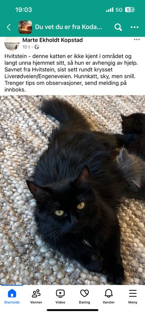 Fiona er en tidligere villkatt som forsvant på Hvitstein i Kodal juni 2025. Hun er veldig sky, men søker ofte andre katter.