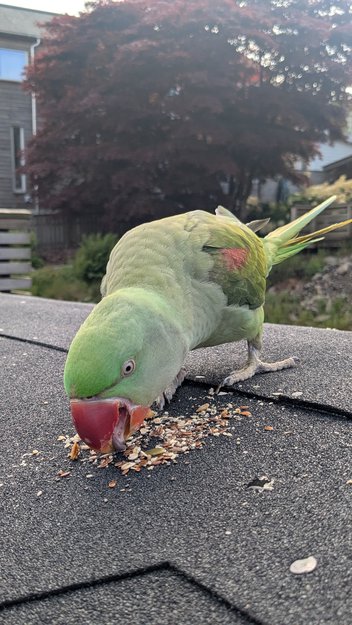 Papegøye landet på taket vårt og har kommet ned på taket på badstua for mat. Virker tam men litt redd. Spiser mat fra hånda.