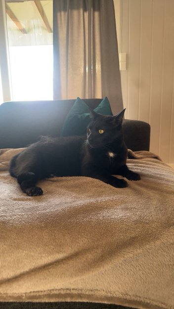 Liten hvit flekk på brystet, ellers helt sort. Kan se litt brun ut i solen. Veldig kosete, men kan være skeptisk til fremmede utendørs i starten. Kan ha gått langt, f.eks til Darbu eller Stenshorne.