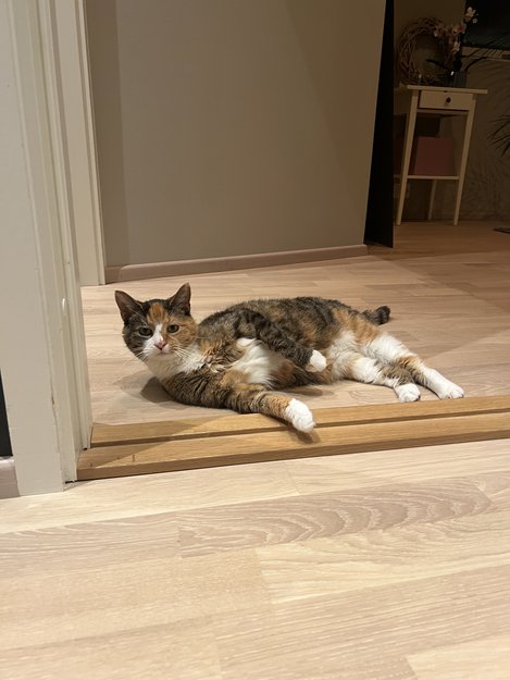 Zelda er rød, hvit og svart/grå i pelsen. Har striper. Hun er ganske sky mot fremmede, men snill og kosete. Ganske liten, ca 3 kg