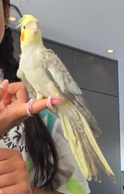 En nymfeparakitt med gult hode, grå kropp og orange kinn.