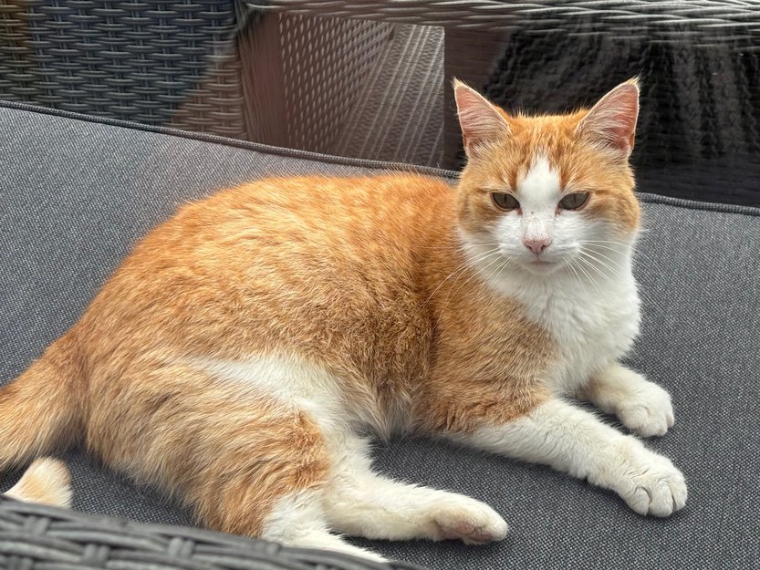 Ung katt, tipper 2 år. Hvit/oransje. Ekstremt snill, sosial og kosete. Får ikke nok av kos. Har ingen forbudtsoner. Legger seg ofte på ryggen. Liker å rulle fra side til side. Ønsker å legge seg opp på mennesker. Uredd.