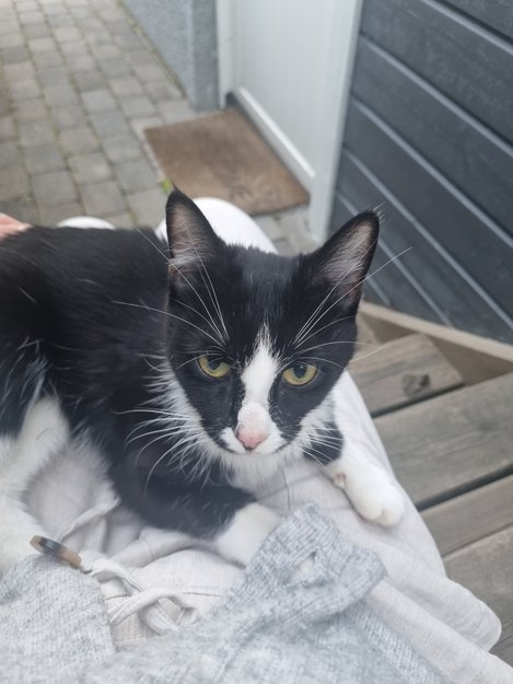 Katt som har dukket opp rundt hus og er veldig kontaktsøkende. Kommer tilbake. Sjekk hos veterinær viser at den ikke er chipet eller sterilisert.